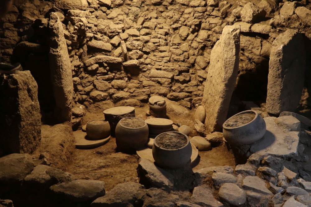 Stone vessels, slabs, and hammerstones found in a kitchen area in Karahantepe (Şanlıurfa Province, Türkiye), 9400–8000 BC.