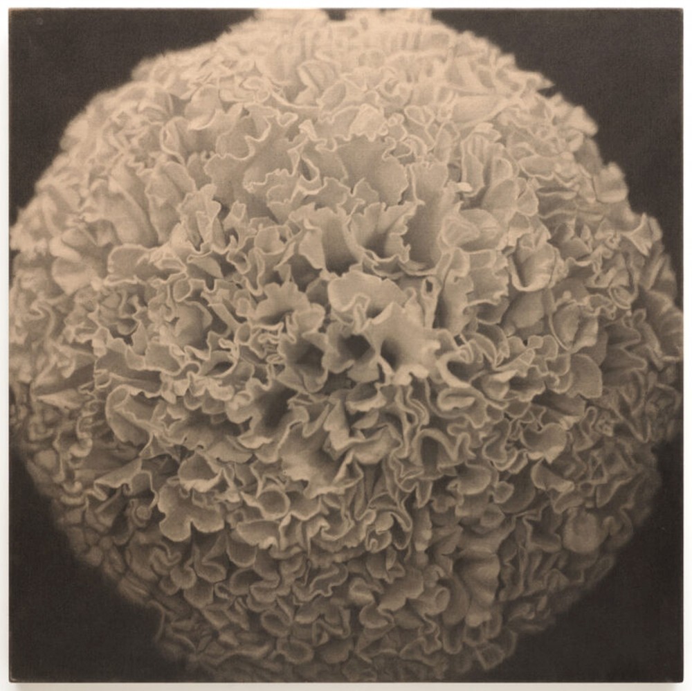 After graduating in 1967, Sugiura moved to New York City, where she was suddenly without access to a color darkroom. In need of a new way to create photographs, she began printing on canvas using photo emulsion. Working in this way allowed her to enlarge her negatives to up to six by eight feet; afterward, she sometimes added graphite or acrylic paint to heighten contrast. Yellow Mum (1969) is an example of work from this period, which features her subject shot at close range, yet closely cropped in a way that renders it enticingly unfamiliar.