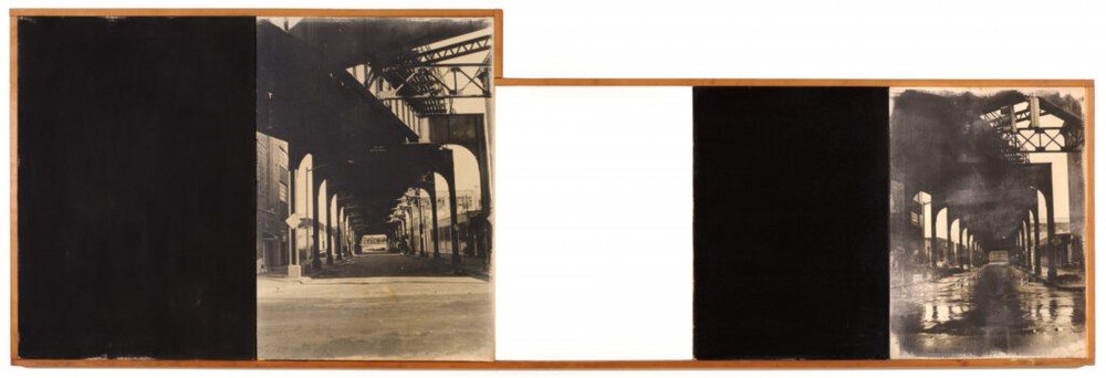 Sugiura continued in the 1970s to combine photography with painting and other media. In her Photopaintings series, she paired photographs printed on canvas with painted panels in a single work, often enclosing them together with wooden supports, sometimes with a pause of empty space in between. While some of these works continued her interest in abstracting familiar organic shapes and subjects, others featured glimpses of life around her in New York City, as in the monumental Deadend Street (1978), which joined monochromatic painted panels with photographs taken at different times of the same location.